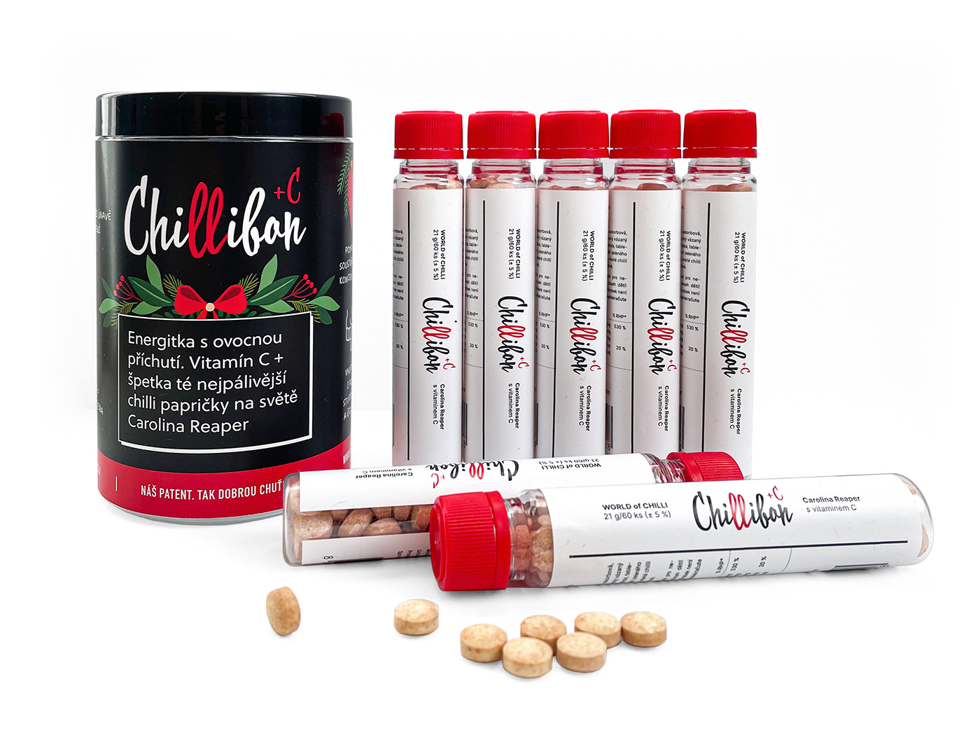 Vánoční set 7 balení Chillibonů v dárkové krabičce. Vitamín "C" s chilli Carolina Reaper na 105 dní energie. Big dávka od Ježíška. A pak přijde jaro, a půjde to samo :-) Těšte se! Ať balíček potěší, chutná a pálí, jak má :-) !